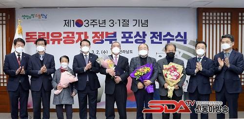 [½Åµ¿¾Æ¹æ¼Û´º½º=Á¤ÁöÀ± ±âÀÚ] Àü¶ó³²µµ´Â 2ÀÏ µµÃ» VIP½Ç¿¡¼­ Á¦103ÁÖ³â 31ÀýÀ» ¸Â¾Æ Á¤ºÎ Æ÷»ó Àü¼ö½ÄÀ» ¿­¾î µ¶¸³¿îµ¿ÀÚ±Ý ¸ð±Ý, ¼ÒÀÛ±Ç ÀÌÀü ºÎ´çÇÔ¿¡ ´ëÇÑ ½ÃÀ§ µîÀ¸·Î Åõ¿ÁµÈ 4¸í¿¡°Ô Æ÷»óÀ» Àü´ÞÇß½À´Ï´Ù.