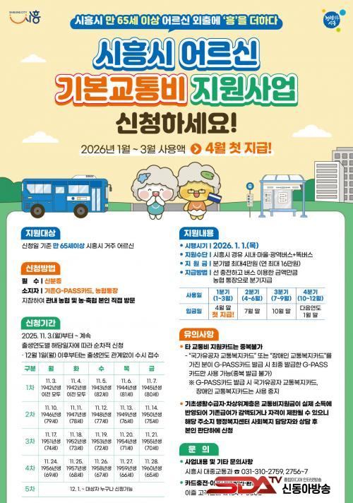À̹ø »ç¾÷Àº ½ÃÈï½Ã¿¡ °ÅÁÖÇÏ´Â ¸¸ 65¼¼ ÀÌ»ó ¾î¸£½Åµé¿¡°Ô ½ÇÁ¦ »ç¿ëÇÑ ±³Åëºñ¸¦ ºÐ±âº°·Î ÃÖ´ë 4¸¸ ¿ø(¿¬ ÃÖ´ë 16¸¸ ¿ø)À» Áö¿øÇÑ´Ù. »çÀü ½ÅûÀº ¿À´Â 11¿ù 3ÀϺÎÅÍ ½ÃÀ۵Ǹç, 2026³â 1¿ù 1ÀÏ ÀÌÈÄ »ç¿ëºÐºÎÅÍ Àû¿ëÇØ °°Àº ÇØ 4¿ù ¸» ù Áö±ÞÀÌ ÀÌ·ïÁú ¿¹Á¤ÀÌ´Ù.