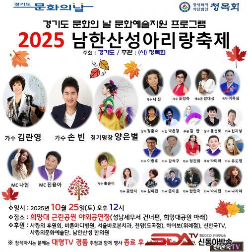 [½Åµ¿¾Æ¹æ¼Û±âÀÚ] °æ±âµµ°¡ ÁÖÃÖÇÏ°í »ç´Ü¹ýÀΠû¸ñȸ°¡ ÁÖ°üÇÏ´Â ¡®Á¦19ȸ ³²Çѻ꼺 ¾Æ¸®¶û ÃàÁ¦¡¯°¡ ¿À´Â 10¿ù 25ÀÏ(Åä) ¿ÀÈÄ 2½Ã, Èñ¸Á´ë ±Ù¸°°ø¿ø ¾ß¿Ü°ø¿¬Àå¿¡¼­ ¿­¸°´Ù. À̹ø Çà»ç´Â °æ±âµµ ¹®È­ÀÇ ³¯ ¹®È­¿¹¼úÁö¿øÇÁ·Î±×·¥ÀÇ ÀÏȯÀ¸·Î, û¸ñȸÀÇ µû¶æÇÑ ºÀ»çÁ¤½Å°ú ÇÔ²² Áö¿ª ¾î¸£½Å°ú Áֹε鿡°Ô ¹®È­ÀÇ ±â»ÝÀ» ÀüÇÏ´Â ÀÚ¸®·Î ¸¶·ÃµÇ¾ú´Ù.