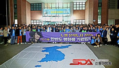 10¿ù 23ÀÏ(¸ñ) ¿ÀÈÄ2½Ã¿¡´Â °ü»êÀ¾ »ï»ê¹æÁ¶Á¦¿¡¼¡®ÅëÀÏ¿°¿ø °È±â´ëȸ¡¯°¡ ¿¸°´Ù. ±º¹Î 350¿© ¸íÀÌ ÆòÈÀÇ »ó¡±æÀ» µû¶ó °È´Â´Ù. ÇöÀå¿¡¼´Â ÅëÀÏÀ½¾Çȸµµ ÇÔ²² ¿·Á ÅëÀÏÀÇ ¸Þ½ÃÁö¸¦ ³ë·¡·Î ÀüÇÑ´Ù.