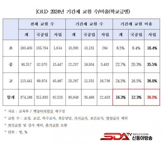 ¡à ±¹È¸ ±³À°À§¿øÈ¸ ¹é½Â¾Æ ÀÇ¿ø(´õºÒ¾î¹ÎÁÖ´ç)ÀÌ ±³À°ºÎ·ÎºÎÅÍ Á¦Ãâ¹ÞÀº ¡®½Ã¡¤µµº° Á¤±Ô ¹× ±â°£Á¦ ±³¿ø ÇöȲ¡¯ ÀڷḦ ºÐ¼®ÇÑ °á°ú, Áö³­ÇØ Àüü »ç¸³Çб³ ±³¿ø 6¸¸ 2,528¸í Áß 2¸¸ 2,483¸í(36.0%)ÀÌ ±â°£Á¦ ±³¿øÀÎ °ÍÀ¸·Î µå·¯³µ´Ù.