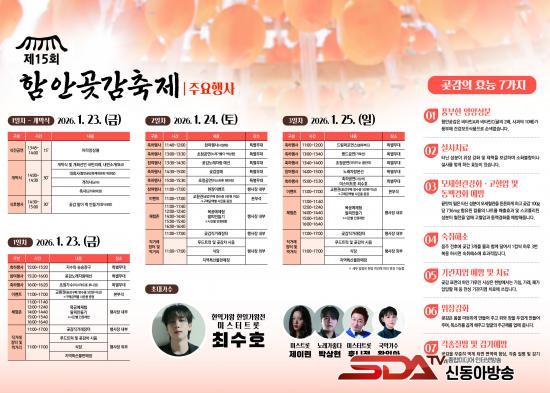 ÃàÁ¦ ù³¯ÀÎ 23ÀÏ(±Ý)¿¡´Â ¿ÀÈÄ 1½Ã 45ºÐ ¾Æ¶ó¾Ó»óºíÀÇ ½ÄÀü °ø¿¬À» ½ÃÀÛÀ¸·Î °³¸·½Ä°ú ´Ù¾çÇÑ Ã¼ÇèÇà»ç, Á÷°Å·¡ÀåÅͰ¡ ¿¸®¸ç ¿ÀÈÄ 5½Ã¿¡ Çà»ç°¡ ¸¶¹«¸®µÈ´Ù. 24ÀÏ(Åä)¿¡´Â ¡®³ë·¡°¡ ÁÁ´Ù¡¯ÀÇ ¹Ú»óÇö°ú ¡®¹Ì½ºÆ®·Ô¡¯ Ãâ½Å Á¦À̸°ÀÌ, 25ÀÏ(ÀÏ)¿¡´Â ±¹¾Ç°¡¼ö ȲÀÎ¾Æ¿Í ¡®¹Ì½ºÅÍÆ®·Ô¡¯ Ãâ½Å ÃÖ¼öÈ£°¡ ÃàÇϰø¿¬À» ÆîÃÄ ÃàÁ¦ ºÐÀ§±â¸¦ ÇÑÃþ µ¸¿ï °èȹÀÌ´Ù. ƯÈ÷ ÇԾȰù°¨ÃàÁ¦ÀÇ ´ëÇ¥ Çà»çÀÎ ¡®°ù°¨¸»À̶± ¸¸µé±â¡¯ Çà»ç¿Í ¡®°ù°¨ ³ë·¡ÀÚ¶û ´ëȸ¡¯´Â ÇØ¸¶´Ù ¸¹Àº Áö¿ª¹ÎÀÇ »ç¶ûÀ» ¹Þ°í ÀÖ´Ù.