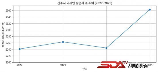 Çѱ¹°ü±¤°ø»ç °ü±¤µ¥ÀÌÅÍ·¦ ÀÚ·á¿¡ µû¸£¸é ÁøÁֽà ¿ÜÁöÀÎ ¹æ¹®ÀÚ ¼ö´Â 2022³â 2241¸¸ ¸í¿¡¼ 2025³â 2363¸¸ ¸íÀ¸·Î ¾à 122¸¸ ¸í(¾à 5.4%) Áõ°¡ÇÑ °ÍÀ¸·Î ³ªÅ¸³µ´Ù. ¿¬µµº°·Î´Â 2022³â 2241¸¸ ¸í, 2023³â 2263¸¸ ¸í, 2024³â 2244¸¸ ¸í, 2025³â 2363¸¸ ¸íÀ¸·Î Áý°èµÆ´Ù.