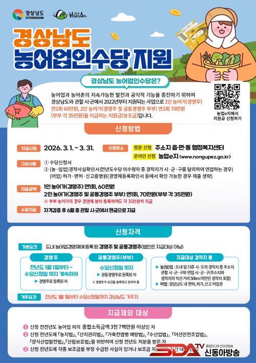 ½Åû ´ë»óÀº 2025³â 1¿ù 1ÀϺÎÅÍ °æ»ó³²µµ¿¡ Áֹεî·ÏÀ» µÎ°í ³ó¾î¾÷°æ¿µÃ¼·Î µî·ÏµÈ °æ¿µÁÖ¿Í °øµ¿°æ¿µÁÖÀ̸ç, °øµ¿°æ¿µÁÖ´Â ºÎºÎ¸¸ ÀÎÁ¤ÇÑ´Ù. ½ÅûÀº ÁÖ¼ÒÁö À¾¸éµ¿ ÇàÁ¤º¹Áö¼¾Å͸¦ ¹æ¹®ÇØ ÇÒ ¼ö ÀÖÀ¸¸ç, ¡®³ó¾÷ÀÌ(e)Áö¡¯ ´©¸®Áý°ú ¾Û¿¡¼­ °£ÆíÇÏ°Ô ½ÅûÇÒ ¼ö ÀÖ´Ù.