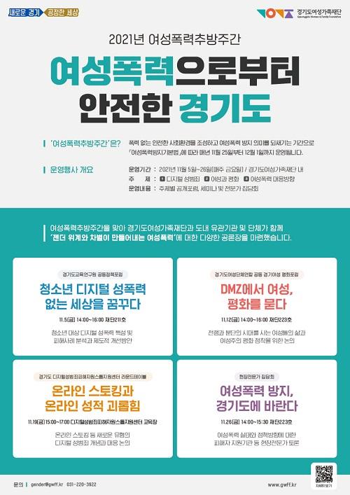 [½Åµ¿¾Æ¹æ¼Û´º½º=¹èÁöÀ± ±âÀÚ] °æ±âµµ¿©¼º°¡Á·Àç´ÜÀÌ ¡®2021³â ¿©¼ºÆø·ÂÃß¹æÁÖ°£¡¯À» ¸Â¾Æ ¿©¼º Æø·Â¿¡ ´ëÇÑ °ø°¨´ë È®»êÀ» À§ÇØ ³× Â÷·Ê ±âȹÇà»ç¸¦ °³ÃÖÇÕ´Ï´Ù. ¡®¿©¼ºÆø·ÂÃß¹æÁÖ°£¡¯Àº Æø·Â ¾ø´Â ȯ°æÁ¶¼º°ú ¿©¼º Æø·Â ¹æÁöÀÇ Àǹ̸¦ µÇ»õ±â´Â ±â°£À¸·Î ¡®¿©¼ºÆø¡¦