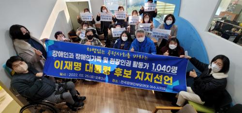 [½Åµ¿¾Æ¹æ¼Û=±è±â³² ±âÀÚ] ¿©¼ö½Ã Àå¾ÖÀÎ ´ç»çÀÚ¿Í °¡Á· ¹× ÀαÇȰµ¿°¡ 1,040¸íÀº 2¿ù25ÀÏ ¿ÀÈÄ 3½Ã »ç)Àü±¹Àå¾ÖÀÎºÎ¸ð¿¬´ë ¿©¼öÁöȸ¿¡¼­ 'ÀÌÀç¸í Èĺ¸ ÁöÁö¼±¾ð ±âÀÚȸ°ß'À» °®°í, ÀÌÀç¸í ´õºÒ¾î¹ÎÁÖ´ç ´ë¼±Èĺ¸ ÁöÁö¸¦ õ¸íÇÏ¿´´Ù. Àå¾ÖÀΰ¡Á·µéÀº ¡°»çȸ ±¸¼º¡¦