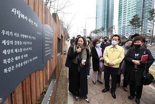 [½Åµ¿¾Æ¹æ¼Û´º½º=Á¤ÁöÀ± ±âÀÚ] ¡®±âºÐ ÁÁÀº º¯È­, ǰ°Ý ÀÖ´Â °­³²¡¯À» ½ÇÇö ÁßÀÎ °­³²±¸(±¸Ã»Àå Á¤¼ø±Õ)°¡ Áö³­´Þ »ï¼ºµ¿ °æ±â°íµîÇб³ ¾ð´ö±æ 400m ±¸°£À» ¡®¹®Á¤Èñ ½ÃÀα桯·Î Á¶¼ºÇß½À´Ï´Ù. ±¸´Â ¡®¼­½Ã¡¯, ¡®ºñ¸Á·Ï¡¯, ¡®°Ü¿ï »ç¶û¡¯ µî ½ÃÀÎÀÇ ÀÛǰ 8ÆíÀ» µ¹°ú¡¦