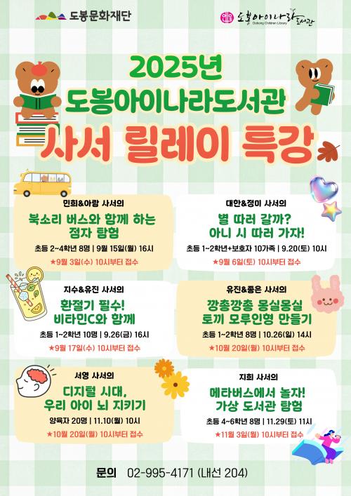 [½Åµ¿¾Æ¹æ¼Û µµºÀ±¸=À̽ŵ¿±âÀÚ] ¼­¿ï µµºÀ±¸ µµºÀ¾ÆÀ̳ª¶óµµ¼­°üÀÌ ¡®»ç¼­ ¸±·¹ÀÌ Æ¯°­¡¯À» ¿î¿µÇÑ´Ù. »ç¼­ ¸±·¹ÀÌ Æ¯°­Àº »ç¼­°¡ Á÷Á¢ °­»ç·Î ³ª¼­ µ¶¼­±³À°À» À̲ô´Â ÇÁ·Î±×·¥ÀÌ´Ù. À¯¾ÆºÎÅÍ ¼ºÀαîÁö °í·ç Âü¿©ÇÒ ¼ö ÀÖÀ¸¸ç, 9¿ùºÎÅÍ 11¿ù±îÁö ÁøÇàÇÑ´Ù. ¿À´Â¡¦