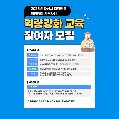 [½Åµ¿¾Æ¹æ¼Û=ÀÌÀçö±âÀÚ] È­¼ºÆ¯·Ê½Ã(½ÃÀå Á¤¸í±Ù)°¡ ÅðÁ÷ ÀηÂÀÇ »çȸ ÀçÁøÃâ°ú ³ëÈÄ Áغñ¸¦ µ½±â À§ÇÑ ¡®¿ª·®°­È­ ±³À°¡¯ 5±â Âü¿©ÀÚ¸¦ ¸ðÁýÇÑ´Ù°í 24ÀÏ ¹àÇû´Ù. º» ±³À°Àº ¡®2025³â È­¼º½Ã ÅðÁ÷Àη ¿ª·®°­È­ Áö¿ø»ç¾÷ : ½ÅÁß³â Á¡ÇÁ¾÷ ÇÁ·ÎÁ§Æ®¡¯ÀÇ ÀÏȯÀ¸·Î ¸¶¡¦