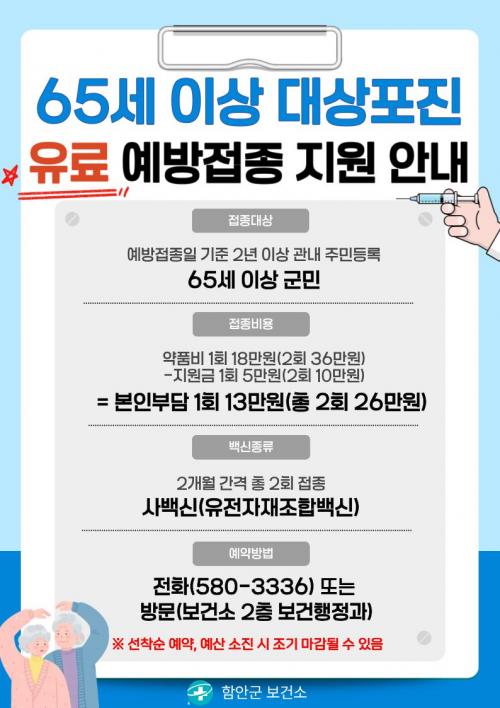 [½Åµ¿¾Æ¹æ¼Û °æ³²ÇÔ¾È=À̽ŵ¿±âÀÚ] ÇԾȱºº¸°Ç¼Ò´Â 2026³â ´ë»óÆ÷Áø ¿¹¹æÁ¢Á¾À» 1¿ù 2ÀϺÎÅÍ ¿¹¾à Á¢¼öÇϸç, Á¢Á¾ ½Ç½Ã´Â 2¿ùºÎÅÍ ÁøÇàÇÑ´Ù°í ¹àÇû´Ù. Á¢Á¾ ´ë»óÀº ¿¹¹æÁ¢Á¾ÀÏ ±âÁØÀ¸·Î 2³â ÀÌ»ó °ü³» Áֹεî·ÏÀ» µÎ°í °ÅÁÖÇÑ 65¼¼ ÀÌ»ó ÁÖ¹ÎÀÌ´Ù. Á¢Á¾À» Èñ¸ÁÇϴ¡¦