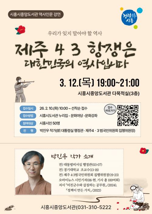 [½Åµ¿¾Æ¹æ¼Û ½ÃÈï½Ã=À̽ŵ¿±âÀÚ] ½ÃÈï½ÃÁß¾Óµµ¼­°üÀº ¿À´Â 3¿ù 12ÀÏ ¿ÀÈÄ 7½Ã, ½Ã¹ÎÀ» ´ë»óÀ¸·Î ¿ª»ç Àι® °­¿¬ ¡®Á¦ÁÖ 4¤ý3Ç×ÀïÀº ´ëÇѹα¹ÀÇ ¿ª»çÀÔ´Ï´Ù¡¯¸¦ ¿î¿µÇÑ´Ù. À̹ø °­¿¬Àº Á¦ÁÖ 4¤ý3Ç×ÀïÀ» ƯÁ¤ Áö¿ªÀÇ ºñ±ØÀÌ ¾Æ´Ñ, ´ëÇѹα¹ Çö´ë»ç ¼Ó¿¡¼­ ¹Ýµå½Ã ±â¾ïÇÏ¡¦