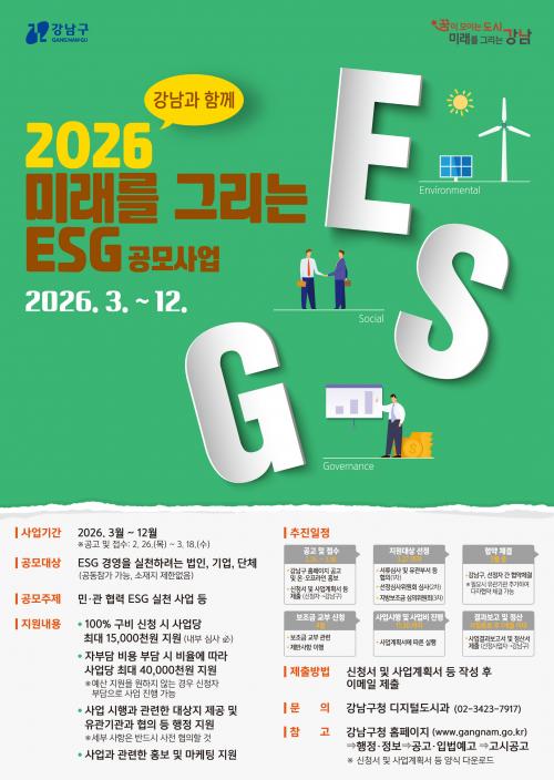 [½Åµ¿¾Æ¹æ¼Û °­³²±¸=À̽ŵ¿±âÀÚ] ²ÞÀÌ ¸ðÀÌ´Â µµ½Ã, ¹Ì·¡¸¦ ±×¸®´Â °­³²±¸°¡ ESG °æ¿µ ½Çõ¿¡ ¶æÀÌ ÀÖ´Â ±â¾÷¡¤´Üü¿Í ´Ù¾çÇÑ Çù·Â»ç¾÷À» ÃßÁøÇÏ´Â ¡®2026 ¹Ì·¡¸¦ ±×¸®´Â ESG, °­³²°ú ÇÔ²²¡¯ °ø¸ð¸¦ ½Ç½ÃÇÑ´Ù. ±¸´Â ¹Î¼± 8±â Ãâ¹ü ÀÌÈÄ °ø°øÀÇ ÇàÁ¤ ¿ª·®¿¡ ¹Î°£ÀÇ Àü¡¦