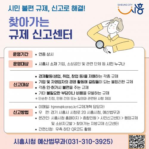 [½Åµ¿¾Æ¹æ¼Û ½ÃÈï½Ã=À̽ŵ¿±âÀÚ] ½ÃÈï½Ã´Â ½Ã¹ÎÀÇ ÀÏ»ó°ú ±â¾÷ Ȱµ¿À» ÀúÇØÇÏ´Â ºÒÇÕ¸®ÇÑ ±ÔÁ¦¸¦ ÇöÀå¿¡¼­ Á÷Á¢ µè°í °³¼±Çϱâ À§ÇØ ¡®Ã£¾Æ°¡´Â ±ÔÁ¦½Å°í¼¾ÅÍ¡¯¸¦ ¿¬Áß »ó½Ã ¿î¿µÇÑ´Ù. ¡®Ã£¾Æ°¡´Â ±ÔÁ¦½Å°í¼¾ÅÍ¡¯´Â ½Ã ¿¹»ê¹ý¹«°ú ´ã´ç Á÷¿øÀÌ °ü³» ±â¾÷°ú ¼Ò»ó°øÀÎ ¡¦