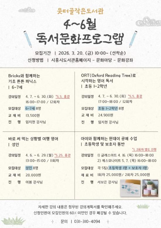 [½Åµ¿¾Æ¹æ¼Û ½ÃÈï½Ã=À̽ŵ¿±âÀÚ] ½ÃÈï½Ã ÀºÇൿ¿¡ ÀÖ´Â ¿ôÅͰñÀÛÀºµµ¼­°üÀº ¿À´Â 4¿ù 6ÀϺÎÅÍ 6¿ù 30ÀϱîÁö ¾à 3°³¿ù°£ »ó¹Ý±â µ¶¼­¹®È­ÇÁ·Î±×·¥À» ¿î¿µÇÑ´Ù. À̹ø ÇÁ·Î±×·¥Àº À¯¾Æ(5~7¼¼), ÃʵîÇлý, ¼ºÀÎÀ» ´ë»óÀ¸·Î ¼öÁغ° ¿µ¾î ÇнÀ ±âȸ¸¦ Á¦°øÇØ ¿µ¾î ¿ª·®À» ¡¦