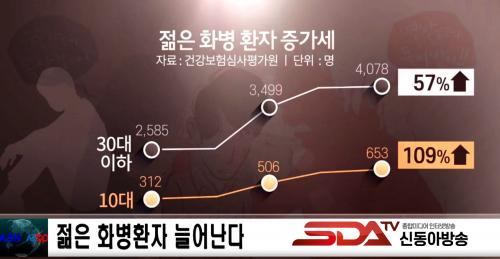 2014³â 2,585¸íÀÌ´ø 30´ë ÀÌÇÏ È­º´ ȯÀÚ´Â Áö³­ÇØ 4,078¸íÀ¸·Î 58% °¡±îÀÌ Áõ°¡Çߴµ¥, ±×Áß 10´ë ȯÀÚµµ 312¸í¿¡¼­ 653¸íÀ¸·Î 2¹è ÀÌ»óÀÌ µÆ½À´Ï´Ù.
