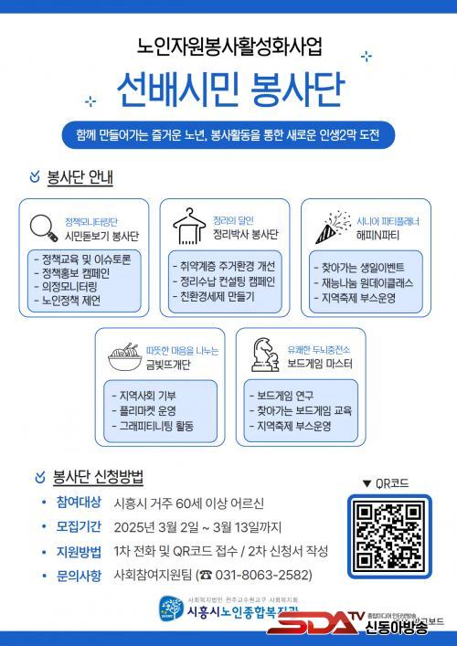 ºÀ»ç´Ü ÀοøÀº ÃÑ 10¸íÀ» ¼±Á¤ÇÒ °èȹÀ¸·Î, ¸ðÁý ±â°£Àº 3¿ù 13ÀϱîÁö´Ù. ½ÅûÀº ½ÃÈï½Ã³ëÀÎÁ¾ÇÕº¹Áö°ü »çȸÂü¿©Áö¿øÆÀ(031-8063-2582)À¸·Î ÀüÈÇϰųª È«º¸ Æ÷½ºÅÍÀÇ Á¤º¸¹«´Ì(Å¥¾ËÄÚµå)¸¦ ÅëÇØ ÇÏ¸é µÈ´Ù.