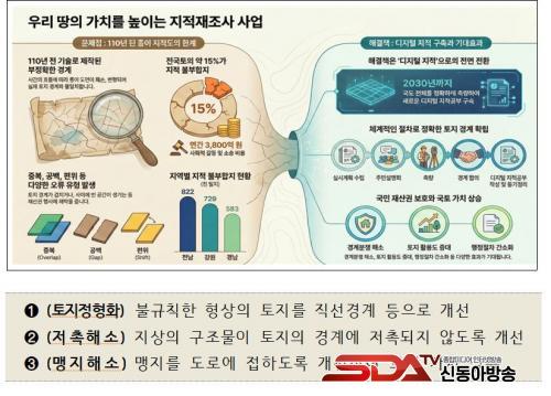 ÁöÀûÀçÁ¶»ç»ç¾÷Àº ÀÏÁ¦°Á¡±â¿¡ ÀÛ¼ºµÈ Á¾ÀÌ ÁöÀûµµ¸¦ µðÁöÅÐ ÁöÀûÀ¸·Î ÀüȯÇÏ°í ½ÇÁ¦ ÅäÁö ÀÌ¿ë ÇöȲ°ú ¸ÂÁö ¾Ê´Â °æ°è¸¦ ¹Ù·ÎÀâ±â À§ÇØ ÃßÁøµÇ´Â ±¹°¡»ç¾÷À¸·Î, ÅäÁö °æ°è ºÐÀï ÇØ¼Ò¿Í ½Ã¹Î Àç»ê±Ç º¸È£¿¡ Áß¿äÇÑ ¿ªÇÒÀ» Çϰí ÀÖ´Ù.