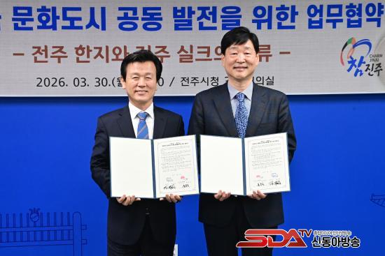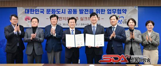 ÁøÁÖ½Ã¿Í ÀüÁֽô Áö³ 30ÀÏ ÀüÁÖ½Ãû¿¡¼ µÎ µµ½Ã °ü°èÀÚ°¡ Âü¼®ÇÑ °¡¿îµ¥ ¡®´ëÇѹα¹ ¹®Èµµ½Ã Á¶¼º ¹× ¹®È ±³·ù Ȱ¼ºÈ¸¦ À§ÇÑ ¾÷¹«Çù¾à(MOU)¡¯À» ü°áÇß´Ù°í ¹àÇû´Ù.