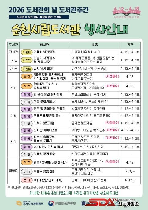 ±âŸ ÀÚ¼¼ÇÑ »çÇ×Àº ¼øÃµ½Ã¸³µµ¼°ü ´©¸®Áý(https://library.suncheon.go.kr/) ¶Ç´Â °¢ µµ¼°üÀ¸·Î ¹®ÀÇÇÏ¸é µÈ´Ù.
