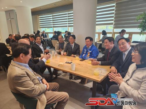 »çÁø¼³¸í: ±è¿µ±Ô ¿©¼ö½ÃÀå ¿¹ºñÈĺ¸(ÆÄ¶õ»ö Á¡ÆÛ)°¡ Áֹεé°ú Â÷´ãȸ¸¦ ÇÏ¸é¼ È¯ÇÏ°Ô ¿ô´Â Ç¥Á¤À¸·Î ¹Ú¼ö¸¦ Ä¡°í ÀÖ´Ù.