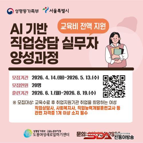 [½Åµ¿¾Æ¹æ¼Û µµºÀ±¸=À̽ŵ¿±âÀÚ] ¼­¿ï µµºÀ±¸°¡ µµºÀ¿©¼º¼¾ÅÍ¿¡¼­ ¡®AI ±â¹Ý Á÷¾÷»ó´ã ½Ç¹«ÀÚ ¾ç¼º°úÁ¤¡¯À» ¿î¿µÇÑ´Ù°í ¹àÇû´Ù. ´ë»óÀº Á÷¾÷»ó´ã»ç, »çȸº¹Áö»ç, Á÷¾÷´É·Â°³¹ßÈÆ·Ã±³»ç µîÀÇ ÀÚ°ÝÁõÀ» ¼ÒÁöÇϰí, Ãë¾÷Áö¿ø ºÐ¾ß·Î Ãë¾÷À» Èñ¸ÁÇÏ´Â ¿©¼º ±¸Á÷ÀÚ´Ù.