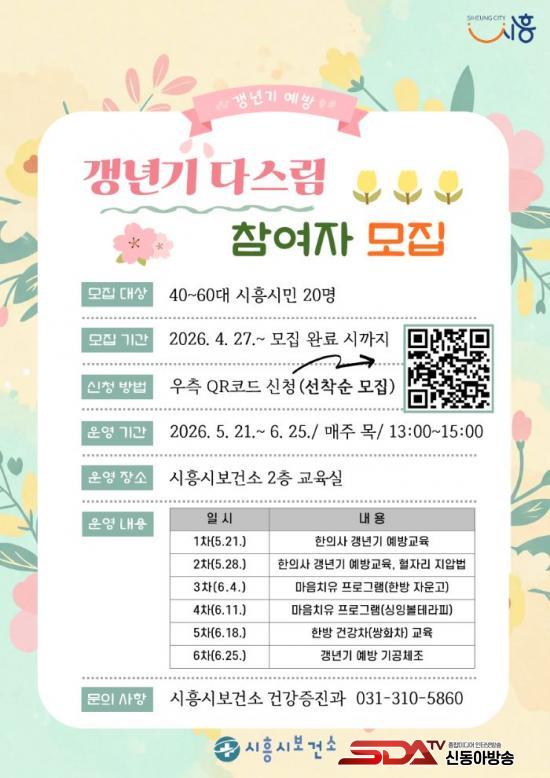 ÇÁ·Î±×·¥Àº ¿À´Â 5¿ù 21ÀϺÎÅÍ 6¿ù 25ÀϱîÁö ¸ÅÁÖ ¸ñ¿äÀÏ ¿ÀÈÄ 1½ÃºÎÅÍ 3½Ã±îÁö ÃÑ 6ȸ¿¡ °ÉÃÄ ½ÃÈï½Ãº¸°Ç¼Ò ±³À°½Ç¿¡¼ ¿î¿µµÈ´Ù. ÁÖ¿ä ³»¿ëÀº ÇÑÀÇ¾à ±â¹Ý °»³â±â ¿¹¹æ±³À°À» ºñ·ÔÇØ Ç÷ÀÚ¸® Áö¾Ð¹ý, ¸¶À½Ä¡À¯ ÇÁ·Î±×·¥, ±â°øÃ¼Á¶, ÇѹæÂ÷ ¸¸µé±â µîÀ¸·Î ±¸¼ºµÆ´Ù.