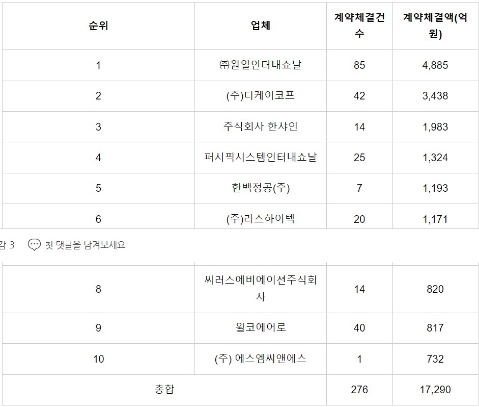 ¹æÀ§»ç¾÷ûÀÌ 2013³â ÀÌÈÄ °è¾àÀ» ü°áÇÑ 6144°Ç Áß ¹«¿ª´ë¸®Á¡(¹«±âÁß°³»ó)À» ÅëÇÑ °è¾àÀÌ 3383°ÇÀ¸·Î ÀüüÀÇ 55.1%, ±Ý¾×Àº 3Á¶2õ¾ï ¿ø¿¡ ´ÞÇÏ´Â °ÍÀ¸·Î È®ÀÎµÆ´Ù°í ¹àÇûÀ¸¸ç,