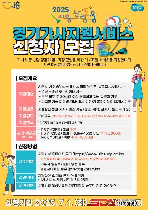 ½Ã´Â À̹ø ½Åû°ø°í¸¦ ÅëÇØ 7¿ù 18ÀÏ 30°¡±¸¸¦ ¿ì¼± ¼±Á¤ ÈÄ, °ø°í¹® ³» ±âÀçµÈ ¿ì¼±¼øÀ§¿¡ µû¶ó 11¿ù ¸»±îÁö ³ª¸ÓÁö 70°¡±¸¿¡ ¼øÂ÷ÀûÀ¸·Î ¼ºñ½º¸¦ Á¦°øÇÒ ¿¹Á¤ÀÌ´Ù. ¼±Á¤µÈ °¡±¸´Â 7¿ù ¸»ºÎÅÍ °¡»ç°ü¸®»ç ¿¬°áÀ» ÅëÇØ °¡±¸´ç ÃÑ 10ȸÀÇ °¡»ç¼ºñ½º(û¼Ò¤ý¼³°ÅÁö¤ý¼¼Å¹¤ý¾²·¹±â ºÐ¸®¼ö°Å)¸¦ Áö¿ø¹ÞÀ» ¼ö ÀÖ´Ù.