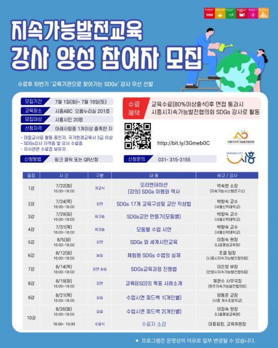 [½Åµ¿¾Æ¹æ¼Û ½ÃÈï½Ã=À̽ŵ¿±âÀÚ] ½ÃÈï½ÃÁö¼Ó°¡´É¹ßÀüÇùÀÇȸ´Â ¿À´Â 7¿ù 22ÀϺÎÅÍ 8¿ù 26ÀϱîÁö ÁøÇàµÇ´Â ¡¸Áö¼Ó°¡´É¹ßÀü±³À° °­»ç ¾ç¼º°úÁ¤¡¹¿¡ Âü¿©ÇÒ ½Ã¹ÎÀ» 7¿ù 19ÀϱîÁö ¸ðÁýÇÑ´Ù. À̹ø ±³À°Àº Áö¼Ó°¡´É°³¹ß¸ñÇ¥(Sustainable Development Goals, ÀÌÇÏ SDGs)¿¡ ´ë¡¦