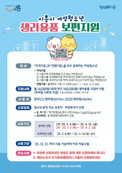 [½Åµ¿¾Æ¹æ¼Û ½ÃÈï½Ã=À̽ŵ¿±âÀÚ] ½ÃÈï½Ã´Â ¡®2025³âµµ ½ÃÈï½Ã ¿©¼ºÃ»¼Ò³â »ý¸®¿ëǰ º¸ÆíÁö¿ø»ç¾÷¡¯ÀÇ ¿Â¶óÀÎ ½ÅûÀ» 8¿ù 1ÀϱîÁö ¹Þ´Â´Ù°í ¹àÇû´Ù. À̹ø »ç¾÷Àº ¿©¼ºÃ»¼Ò³âÀÇ °Ç°­±Ç°ú À뱂 ÁõÁøÀ» À§ÇØ »ý¸®¿ëǰ ±¸¸Åºñ¿ëÀ» Áö¿øÇÏ´Â °ÍÀ¸·Î, Áö¿ªÈ­ÆóÀÎ ¡®½Ã·ç(¸ð¹Ù¡¦