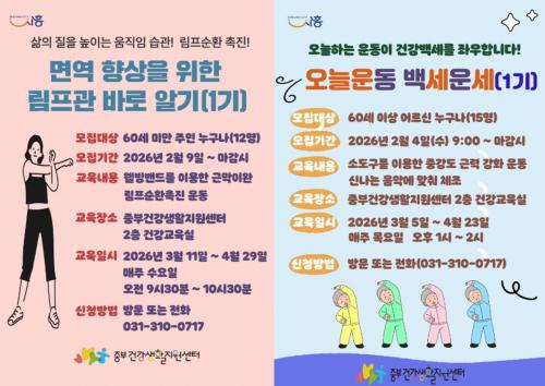 [½Åµ¿¾Æ¹æ¼Û ½ÃÈï½Ã=À̽ŵ¿±âÀÚ] ½ÃÈï½Ãº¸°Ç¼Ò Áߺΰǰ­»ýȰÁö¿ø¼¾ÅÍ¿¡¼­´Â ÀÏ»ó ¼Ó ¿òÁ÷ÀÓÀÌ ½×¿© ³»ÀÏÀÇ °Ç°­ÇÑ »îÀ¸·Î À̾îÁú ¼ö ÀÖµµ·Ï, Áö¿ªÁֹΠ´ë»ó ½ÅüȰµ¿ ÇÁ·Î±×·¥ ¡®¿À´Ã ¿îµ¿ ¹é¼¼ ¿î¼¼¡¯¿Í ¡®¸é¿ª Çâ»óÀ» À§ÇÑ ¸²ÇÁ°ü ¹Ù·Î ¾Ë±â¡¯¸¦ ¿î¿µÇÑ´Ù. ¡®¿À´Ã ¡¦