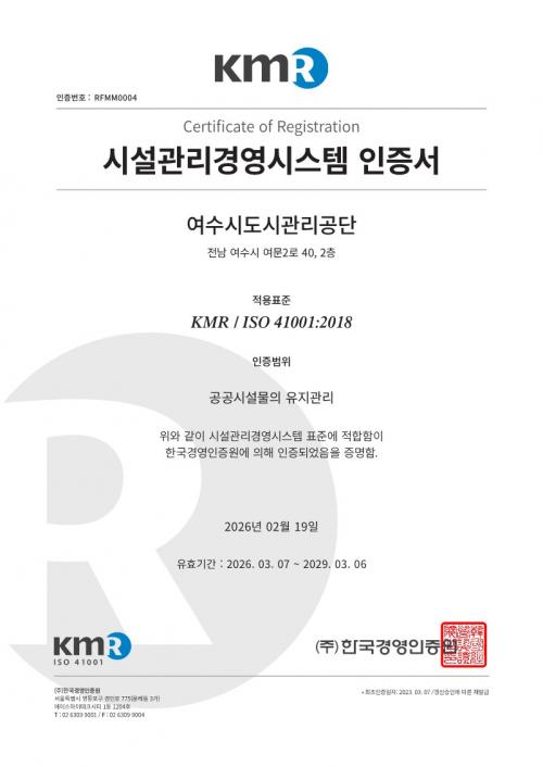 [½Åµ¿¾Æ¹æ¼Û ¿©¼ö=±è±â³² ±âÀÚ] ¿©¼ö½Ãµµ½Ã°ü¸®°ø´Ü(ÀÌ»çÀå ¼Ûº´±¸)Àº Çѱ¹°æ¿µÀÎÁõ¿ø(KMR)À¸·ÎºÎÅÍ ½Ã¼³°ü¸®°æ¿µ½Ã½ºÅÛ(ISO 41001) ÇöÀå½É»ç¸¦ °ÅÃÄ, 19ÀÏ ÀçÀÎÁõÀ» ÃÖÁ¾ ÃëµæÇß´Ù°í ¹àÇû´Ù. ½Ã¼³°ü¸®°æ¿µ½Ã½ºÅÛ(ISO 41001:2018)Àº ±¹Á¦Ç¥ÁØÈ­±â±¸(ISO)°¡ Á¦Á¤ÇÑ¡¦