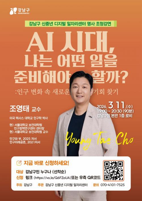[½Åµ¿¾Æ¹æ¼Û °­³²±¸=À̽ŵ¿±âÀÚ] ²ÞÀÌ ¸ðÀÌ´Â µµ½Ã, ¹Ì·¡¸¦ ±×¸®´Â °­³²±¸°¡ ÀΰøÁö´É(AI) È®»ê°ú Àα¸±¸Á¶ º¯È­°¡ µ¿½Ã¿¡ ¸ô°í ¿À´Â ÀÏÀÚ¸® ÀçÆí¿¡ ´ëÀÀÇϱâ À§ÇØ ½ÅÁ߳⠴ë»ó ¸í»ç Ư°­À» ¿¬´Ù. 3¿ù 11ÀÏ ¿ÀÈÄ 7½ÃºÎÅÍ 8½Ã 30ºÐ±îÁö ±¸Ã» º»°ü 1Ãþ ·Îºñ¿¡¼­ ¡®AI ½Ã´ë¡¦