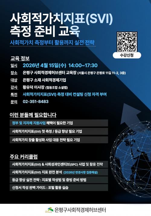 [½Åµ¿¾Æ¹æ¼Û ÀºÆò±¸=À̽ŵ¿±âÀÚ] ¼­¿ï ÀºÆò±¸´Â ¿À´Â 15ÀÏ ÀºÆò±¸ »çȸÀû°æÁ¦Çãºê¼¾ÅÍ¿¡¼­ »çȸÀû°æÁ¦±â¾÷À» À§ÇÑ ¡®»çȸÀû°¡Ä¡ÁöÇ¥(SVI) ÃøÁ¤ Áغñ ±³À°¡¯À» ½Ç½ÃÇÑ´Ù°í ¹àÇû´Ù. ÃÖ±Ù »çȸÀû°æÁ¦±â¾÷ Áö¿ø»ç¾÷¿¡¼­ »çȸÀû°¡Ä¡ÁöÇ¥¸¦ Ȱ¿ëÇÑ Æò°¡ ºñÁßÀÌ È®´ëµÇ¸é¼­,¡¦
