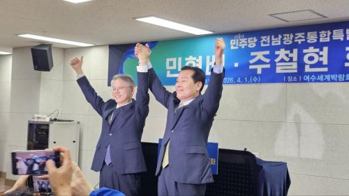 [½Åµ¿¾Æ¹æ¼Û ¿©¼ö=±è±â³² ±âÀÚ] ´õºÒ¾î¹ÎÁÖ´ç Àü³²±¤ÁÖÅëÇÕÆ¯º°½ÃÀå Èĺ¸ °æ¼±¿¡ ³ª¼± ÁÖöÇö Èĺ¸¿Í ¹ÎÇü¹è È帰¡ 1ÀÏ °øÅëÀÇ °¡Ä¡¡¤Á¤Ã¥¿¬´ë¸¦ ¹ÙÅÁÀ¸·Î Àü°ÝÀûÀÎ Èĺ¸ ´ÜÀÏÈ­¸¦ ¼±¾ðÇß´Ù. µÎ È帴 À̳¯ ¿ÀÀü ¿©¼ö¼¼°è¹Ú¶÷ȸÀå ÄÁº¥¼Ç¼¾ÅÍ¿¡¼­ °³ÃÖÇÑ °øµ¿ ±â¡¦