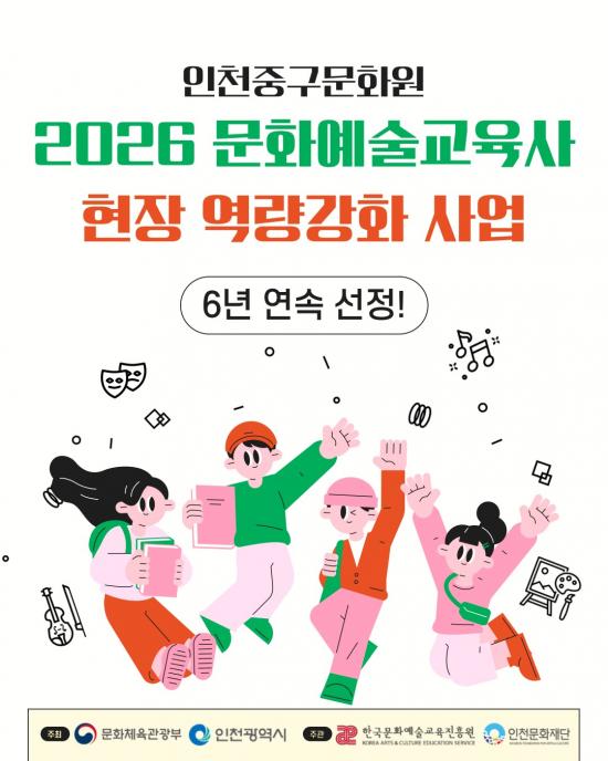ÀÎõÁß±¸¹®È­¿ø(¿øÀå ¹ÚºÀÁÖ)ÀÌ ¹®È­Ã¼À°°ü±¤ºÎ¿Í ÀÎõ±¤¿ª½Ã°¡ ÁÖÃÖÇϰí, ÀÎõ¹®È­Àç´Ü ÀÎõ¹®È­¿¹¼ú±³À°Áö¿ø¼¾ÅÍ¿Í Çѱ¹¹®È­¿¹¼ú±³À°ÁøÈï¿øÀÌ ÁÖ°üÇÏ´Â <2026 ¹®È­¿¹¼ú±³À°»ç ÇöÀå ¿ª·®°­È­ »ç¾÷(ÀÎõ)>¿¡ 6³â ¿¬¼Ó ¼±Á¤µÇ´Â Äè°Å¸¦ ´Þ¼ºÇß´Ù. ¡®¹®È­¿¹¼ú±³À°»ç Çö¡¦