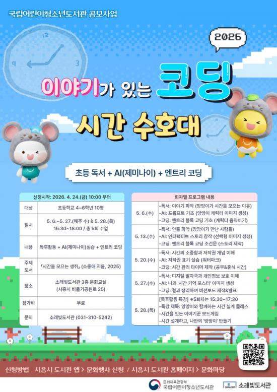 [½Åµ¿¾Æ¹æ¼Û ½ÃÈï½Ã=À̽ŵ¿±âÀÚ] ½ÃÈï½Ã ¼Ò·¡ºûµµ¼­°üÀº ±¹¸³¾î¸°ÀÌû¼Ò³âµµ¼­°üÀÌ ÁÖÃÖÇÏ´Â ¡®2026³â À̾߱Ⱑ ÀÖ´Â ÄÚµù¡¯ °ø¸ð»ç¾÷ ¿î¿µ±â°üÀ¸·Î ¼±Á¤µÅ ¿À´Â 5¿ù 6ÀϺÎÅÍ ¾î¸°ÀÌ ´ë»ó µ¶¼­¡¤µðÁöÅÐ À¶ÇÕ ÇÁ·Î±×·¥À» ¿î¿µÇÑ´Ù. ¡®À̾߱Ⱑ ÀÖ´Â ÄÚµù¡¯Àº ÃʵîÇб³¡¦
